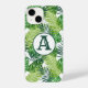 Colourful watercolor green tropical monstera, palms and fern leaves on a white background with monogram A design.