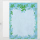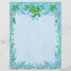 Green sea turtle in cutout style against chequered blue background. Unlined stationery. Blank letterhead paper with stylized flame border.