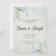 This wedding invitation features a delicate pastel green background with a soft watercolor design and delicate green and blue foliage in the corners. The leaves and branches create a serene feel and are complemented by touches of gold accents, making your celebration of your special day modern and elegant.