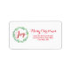 Christmas address labels in red and green with festive watercolor pattern wreath with Joy in hand lettered style text.