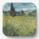 Green Wheat Field with Cypress. Vincent van Gogh. Cute summer landscape. There is a house on a green field. There is a tree growing next to the house. There is tall grass on the field. Clouds are running across the blue sky. Reproduction of famous works of art images in the public domain.