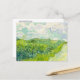 A fine art Postcard with the post-impressionism painting, Green Wheat Fields, Auvers (1890), by the Dutch artist Vincent van Gogh (1853-1890). Beautiful green fields with swirled clouds and a blue sky.