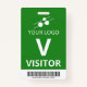 Vertical visitor badge with a simple design in white against a green background. A large white V makes it easy to quickly recognize the visitor as such. Personalize with your business logo and a bar code.