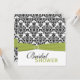 This black and white damask bridal shower invitation with a pear green FAUX ribbon and jewelled brooch matches the wedding invitations shown below. All the text is customizable and so is the paper choice. If there are any other items you need to make your event extra special, please email your request to niteowlstudio@gmail.com. If you want this invitation in another colour combination, email the request to the above address.