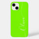Green White Elegant Calligraphy Script Custom Personalized Name iPhone 14 Smart Phone Cases features a modern and trendy simple and stylish design with your personalized name in elegant hand written calligraphy script typography on a green background. Designed by ©Evco Studio www.zazzle.com/store/evcostudio
