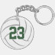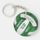 This green and white girls' volleyball team colours keychain features a floral kaleidoscopic pattern blended with the green volleyball panels and an artsy abstract swirl pattern blended with the white panels - her name, court position, team name and school / club year are customizable on the front, as is her jersey number on the back overlying a simple volleyball seams graphic - by katz_d_zynes