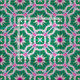 Seamless geometric pattern featuring geometric shapes in white and pink on a green background.