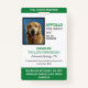 Vertical service dog ID in green and white. Add a photo of your service dog along with name, title, and registration number. Add the handler's name and contact information too.