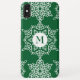 This Christmas phone case features a pretty white snowflake pattern design with monogram on a green background. Personalize it with an initial.