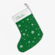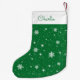 This festive Christmas stocking features a cute winter pattern with white snowflakes and stars on a green background. Personalize it with a name in a green script font at the top.