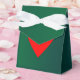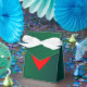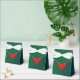 A plain rich green favour box with a red heart on the front. White threaded ribbon at the top.A Valentines Day Box.