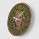 A Green Woman carved in wood with paint applied to the oak leaves and hair.