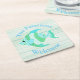 Beach cottage theme pulp board paper coasters, with graphics of a whimsical blue, green and white patterned fish, on a light green wood washed looking background. Personalize the blue arched text to suit your needs. Great for anytime use and makes a nice gift idea.