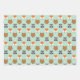 Cute woodland animal wrapping paper sheets featuring bear, fox, and raccoon faces in a pattern with stylized pine trees on a light green background.