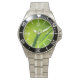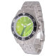 Has heft and feel of expensive stainless steel quartz watches. Good band with safety catch. I removed links, which is easy because engraved arrows show direction to push the linking pins. As always by this seller, the image (a railroad logo) is a perfect reproduction of my emailed image, and is precisely spaced and aligned.