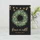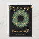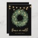 These trendy and stylish cards feature a pretty, watercolor green wreath with gold coloured star accents and elegant string lights, with modern script calligraphy that says "Peace on earth" on a dark, black background.