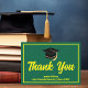 This modern green and yellow custom graduation thank you card features classy handwritten thanks above your high school or college name for the class of 2025. Customize with your name under the black grad cap for great personalized graduate thank you cards.