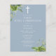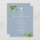 This elegant eucalyptus greenery botanical dusty blue first holy communion invitation postcard can be personalized with your information in chic typography with monogram initials on the reverse. Designed by Thisisnotme©