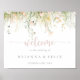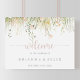 This greenery boho wildflower wedding welcome sign is perfect for a rustic wedding. The design features watercolor pink, blush, yellow, and white wildflowers arranged in elegant bouquets.