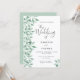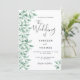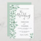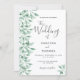 A trendy botanical wedding invitation in white and green. A chic white background on the front. Decorated with greenery, foliage and sprigs. Modern large handlettered script, typography with the text: The wedding of. Templates for your first names and wedding details. Dark grey text.