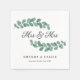 Lesbian wedding napkins with Mrs & Mrs written in a beautiful script with a pretty ampersand framed by greenery twigs curved around the text in muted shades of cool green.