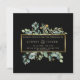This beautiful elegant holiday wedding invitation features a classic gold geometric frame with greenery eucalyptus. Christmas greenery on a modern black background. Perfect design for your winter wedding.