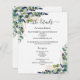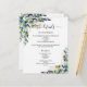 A modern, elegant wedding details/program/timeline. A white background decorated with eucalyptus greenery and golden foliage. Personalize and add your names and wedding details. Black coloured letters.