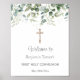Celebrate your child's First Holy Communion in style with our customizable Welcome Poster Sign! Featuring a gold-coloured crucifix and delicate eucalyptus leaves on a pure white background, this poster is the perfect way to welcome your guests to your child's special event.