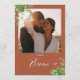 These elegant botanical greenery floral wedding table numbers can be personalized with your photo and table numbers in chic typography on a terracotta background. The cards are printed on the front and back (double-sided). Designed by Thisisnotme©