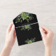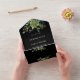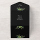 This all-in-one wedding invitation features botanical greenery falling across elegant typography on a black background. The invitation includes a perforated RSVP card featuring a QR code. Designed by Thisisnotme©