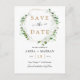 This elegant and customizable Save the Date gives geometric gold frame with watercolor leaves & has been paired with a whimsical calligraphy and a classy serif font in gold and grey, with a post card back.