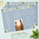 This elegant wedding trifold program features floral greenery and string lights on a dusty blue background. Designed by Thisisnotme©