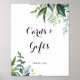 This greenery tropical calligraphy cards and gifts sign is perfect for a modern wedding or bridal shower. The design features predominantly green tropical leaves.