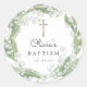 Customizable modern baptism stickers featuring a delicate lily of the valley floral design surrounding an ornate gold print cross, on a clean background with elegant lettering.