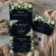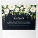 This greenery white floral royal blue trifold wedding invitation is perfect for a rustic wedding. The design features elegant watercolor white peonies with green foliage in a dark blue background.