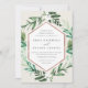 Choose these richly coloured botanical wedding invitations for elegant winter weddings, fall or autumn nuptials, or evening weddings in the summer. Chic design combines natural and geometric elements for a fresh and modern look. Your wedding details appear in rich off-black lettering on a white geometric element with a faux copper foil border, surrounded by green foliage, lush leaves, and small white flowers. A warm cream ivory background adds softness and detail. Matching items available in our Greenhouse collection.