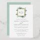Our Greenhouse monogram wedding invitation features your initials, monogram or duogram at the top, nestled inside a square wreath of green watercolor foliage, botanical leaves and tiny white flowers on a crisp white background with gold foil trim. A modern take on the botanical trend for winter weddings, romantic fall or autumn nuptials, or elegant summer evening weddings.