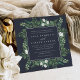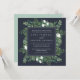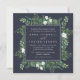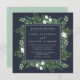Choose these richly coloured botanical wedding invitations in a chic square format for elegant winter weddings, fall or autumn nuptials, or evening weddings in the summer. Your wedding details appear in crisp white lettering, framed by green foliage, lush leaves, and small white flowers. A deep navy blue background adds richness and drama. Matching items available in our Greenhouse collection.