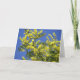 This greeting card features bright yellow mimosa in full bloom against a crisp blue sky background