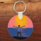 Greeting to the Sun. A man is standing on a beach facing toward the open sea and saluting the yellow sun with raised arms.