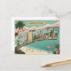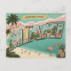 This postcard features a classic "Large Letter" vintage design with "MIAMI" prominently displayed. Each letter is filled with iconic scenes and elements of Miami, including palm trees, sandy beaches, turquoise waters, classic architecture, and even a flamingo. A banner above the letters reads "GREETINGS FROM", all set against a pastel sky, capturing the nostalgic charm of a tropical destination.