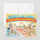 Bright and charming greeting card shows a whimsical cartoon of Southern California - cute characters enjoy the warm California sun who shines high above it all.