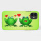 Grenouilles vertes de bande dessinée, garçon et grenouille de fille avec les coeurs rouges, mignon, drôle et expressif, arrière - plan vert/jaune de gradient.