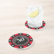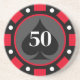 Dessous de verre en pierre personnalisée en forme de grande puce de poker. Design élégant de jeton de marqueur de casino avec icône de spade. Couleurs personnalisables. Exemple rouge. Personnalisez avec nom, monogramme, initiales, montant en dollars, âge ou nombre de chance. Typographie classique. Idéal pour la fête de mariage, anniversaire thématique, événement de destination etc. Barres de boisson aux formes rondes.