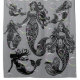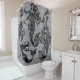 Shower curtain with illustrations of mermaids in black against a grey background with iridescent bubbles.