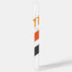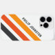 iPhone case featuring three diagonal stripes in dark grey and two shades of orange on a white background and your custom name in a bold, modern sans serif font.