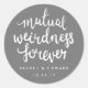 A simple design saying "mutual weirdness forever" in white brush lettering on a grey background. You can change the colour of the background to whatever you want to match your colour scheme. Underneath, you can write the names and date of the wedding or a small message of thanks.