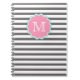 NewParkLane - Monogram Notebook, with an abstract pattern of grey and white stripes, and a teal and hot pink badge for your monogram or personalized text.