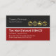 A retro grey and red layer with a white demarcation line. Over at the top lies your prestigious name and job title with a gold handyman tools design to its right. The tools can represent some of the services that you offer e.g. the drill-measuring tape can stand for home remodeling, construction etc. Just below this, in the red layer is the business name and slogan caption which you can change alongside the contact details.