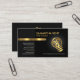 An exquisite grey and black layered design is accentuated by a faux gold stripe near the top of the card. Riding this gold stripe of success lies your prestigious name and the job title (in faux gold) with a gold "bulb and sprocket" motif just underneath. At the grey column, card details are located near the white lines. Towards the lower right corner, is a slogan caption option for you to publicize your services.